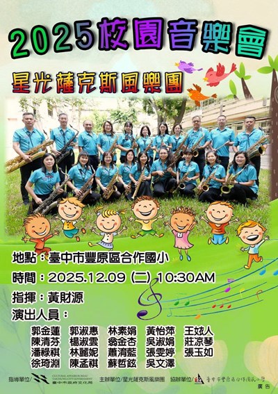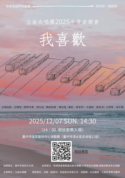 活動地點:太平區宜欣里聯合活動中心(宜昌東路1號) 指導老師/指揮:甘佳勳 #免費入場,演出當天13:30開放入場,額滿為止。 #臺中市政府文化局 |